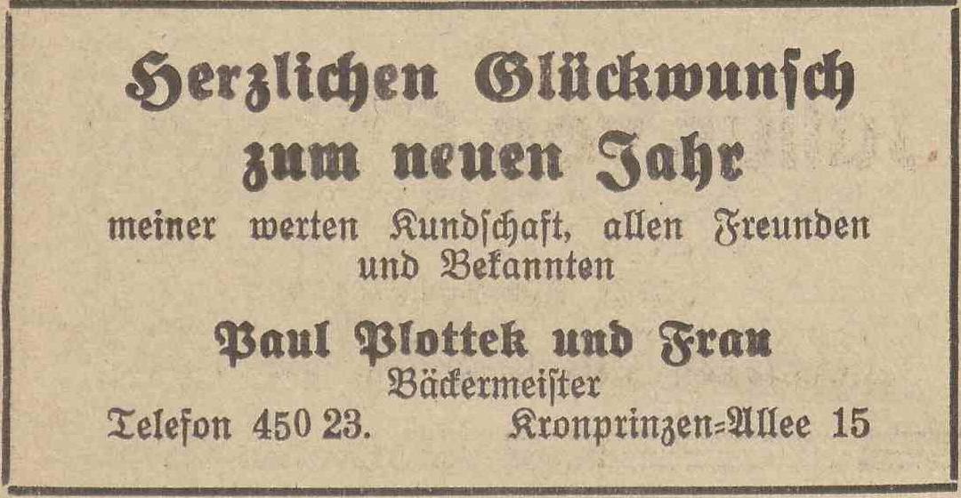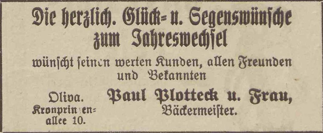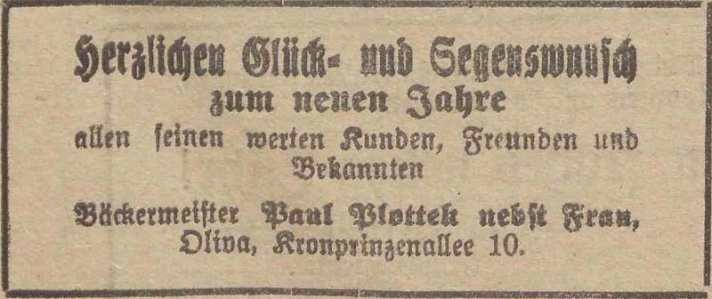 Paul Plottek, Bäckermeister. Podziękowania noworoczne, Olivaer Zeitung nr 306 z 31. 12. 1928.