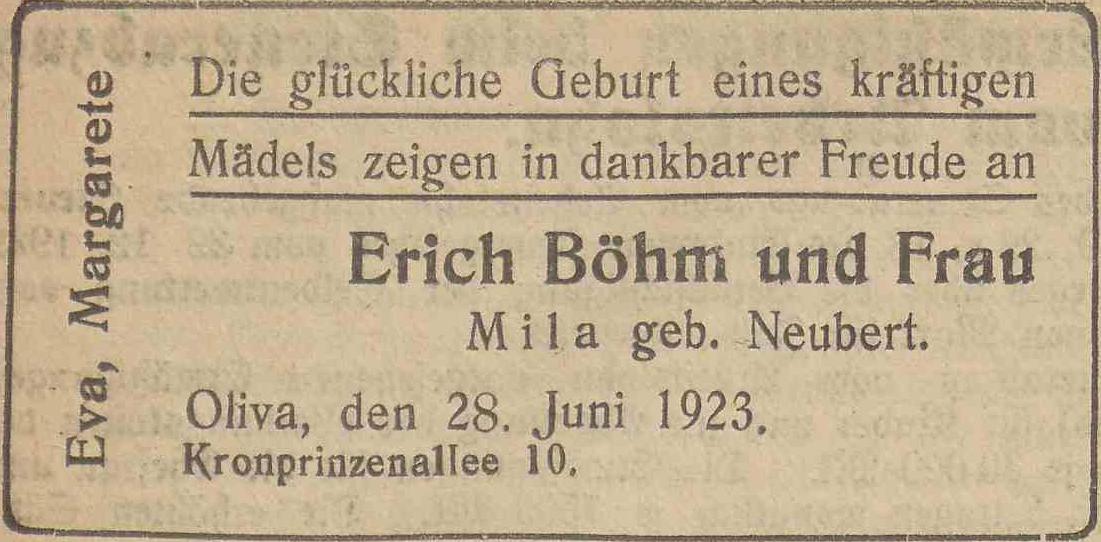 Erich Böhm. Mila Böhm zd. Neubert (Bahnstraße 2 - Poczty Gdańskiej 2). Olivaer Zeintung nr 150 z 30. 06. 1923 r.