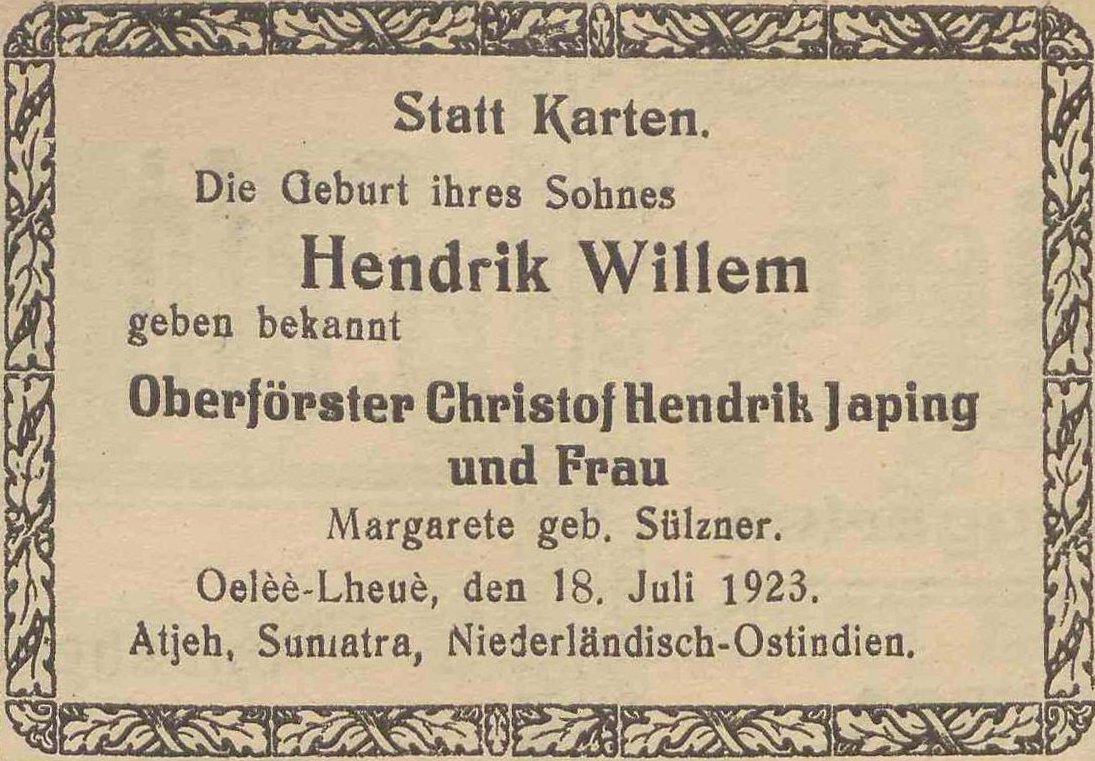 Margarette Willem zd. Sülzner. Hendrik Willem. Olivaer Zeintung nr 220 z 21. 09. 1923 r.
