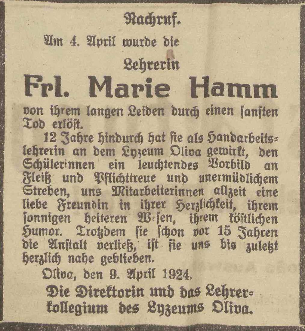Marie Hamm. Olivaer Zeintung nr 86 z 10. 04. 1924 r.