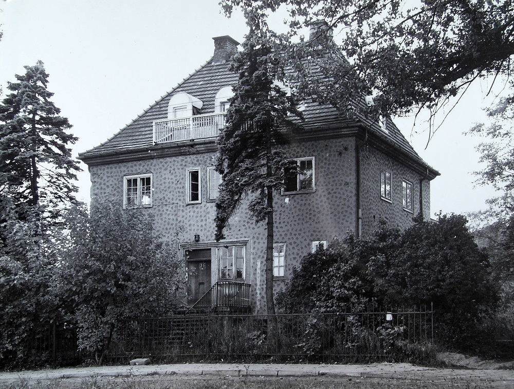 Za drzewem budynek nr 14 przy ul. Grottgera. Za nim od lewej budynki nr 36, 38 i 40 przy ul. Wita Stwosza w Oliwie. Fot. z 1941 roku. Ze zbiorów Jana Daniluka.