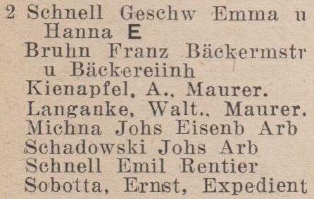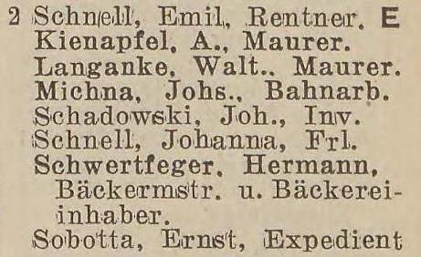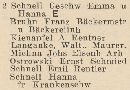 Anna Schnell. Książka adresowa gminy Oliwa z 1916 roku. Zbiory Mirosława Piskorskiego.