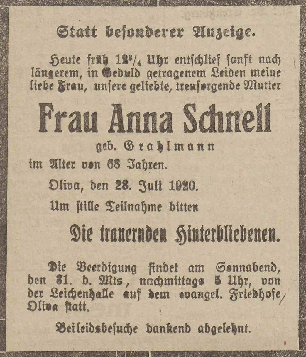 Anna Schnell zd. Grahlmann. Olivaer Zeintung nr 176 z 30. 07. 1920 r.