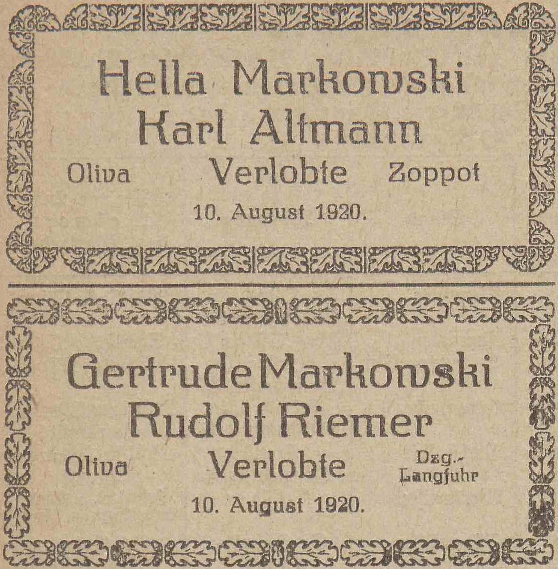 Hella Markowski - Karl Altmann (Zopoot). Gertrude Markowski - Rudolf Reimer (Langfuhr). Olivaer Zeintung nr 187 z 12. 08. 1920 r.