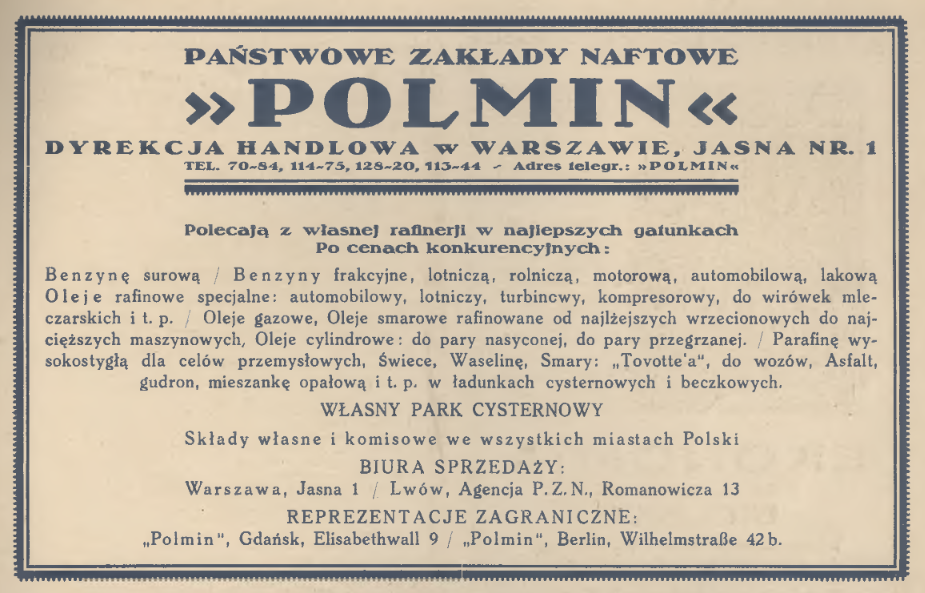 W 1938 roku 27 rafinerii wyprodukowało ponad 100 tys. ton benzyn. Państwowa Fabryka Olejów Mineralnych „Polmin” była największym przedsiębiorstwem rafineryjnym. Ale branża była niezwykle rozdrobniona. Liczba wszystkich zakładów naftowych była bardzo wysoka – 454 w 1938 roku.