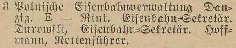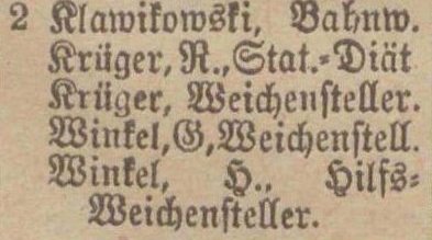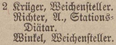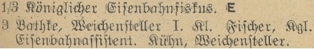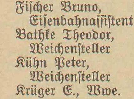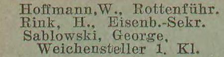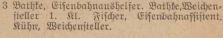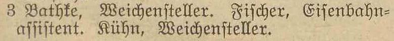 Bock, Carl, Stations-Assistent. Winkel, Gottfried, Weichensteller. Krüger, Errst, Weichensteller.