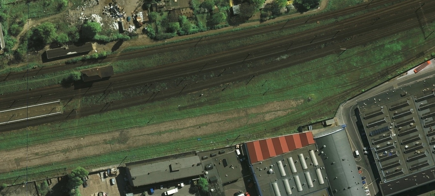 Zarośnięty trawą fragment torowiska prowadzącego do dawnej fabryki kolejek wąskotorowych HOENE częściowo zlikwidowanego pomiędzy 2008-2011 rokiem. Całkowicie pomiędzy rokiem 2011-2014.