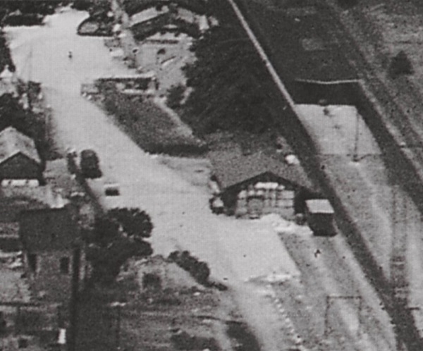 Fragment torów kolejowych przebiegających przez Oliwę. Dworzec. Budynek administracji (powojenna przychodnia). Budynek przeładunkowy z rampą (urząd celny). Fragment z albumu: Herder Institut, Gdańsk na fotografii lotniczej z okresu międzywojennego, Via Nowa Wrocław 2010.