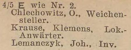 Arndt, Johann, Arbeiter. Bankewitz, Anton, Arbeiter. Bieschkowski, Johann, Schäfer. Junski, Carl, Arbeiter. Moca, Franz, Arbeiter. Prehna, Rosalie, geb. Schwabe, Ww.