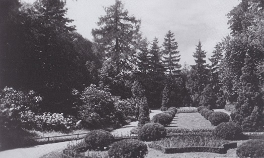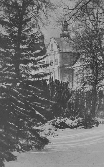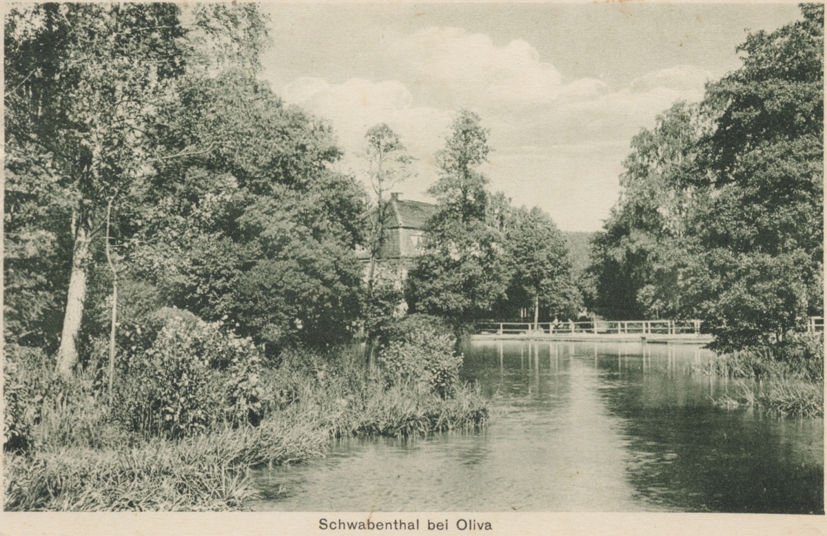 Południowa część Parku Oliwskiego. W głębi Nowy Pałac Opatów wzniesiony wg projektu Efraima Szregera w latach 1754-1756. Mieszkał w nim ostatni polski opat Jacek Rybiński (ur. 28. 2. 1701, zm. 15. 4.1782).