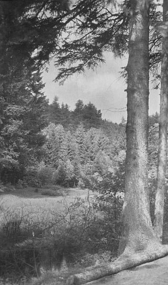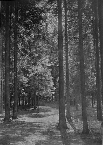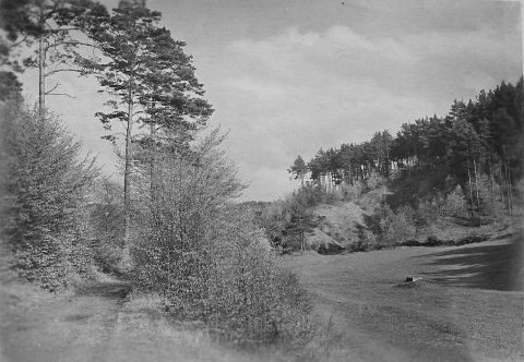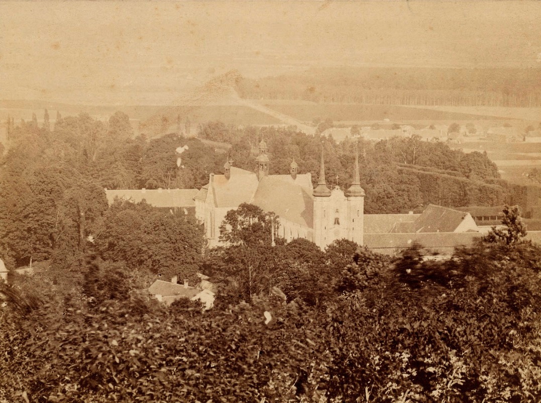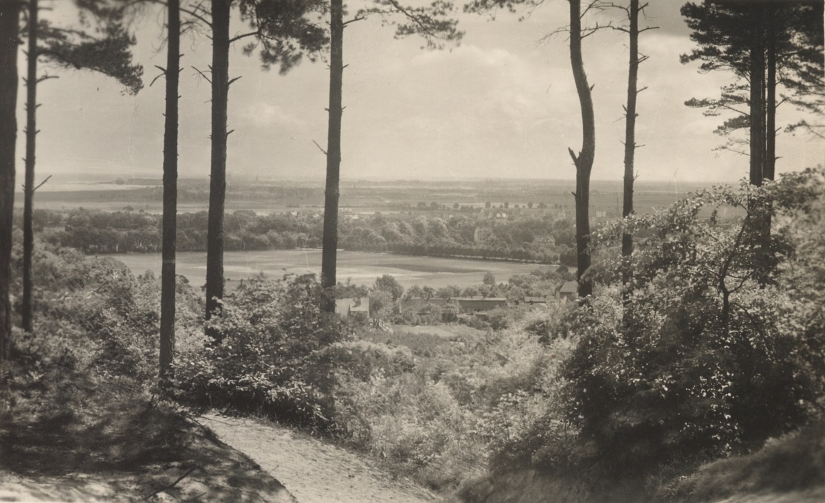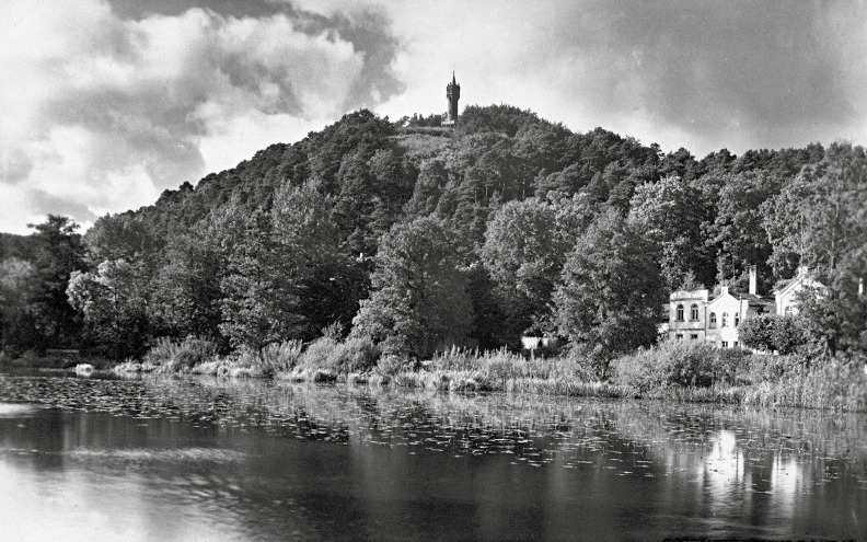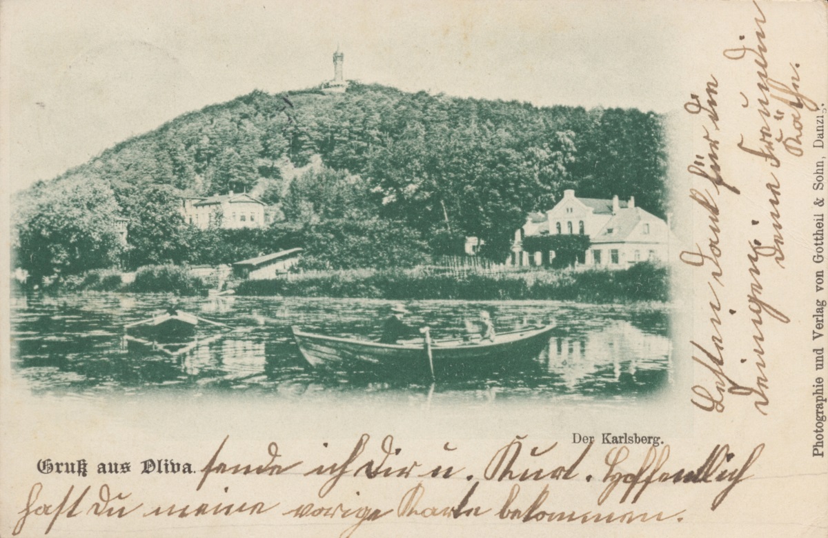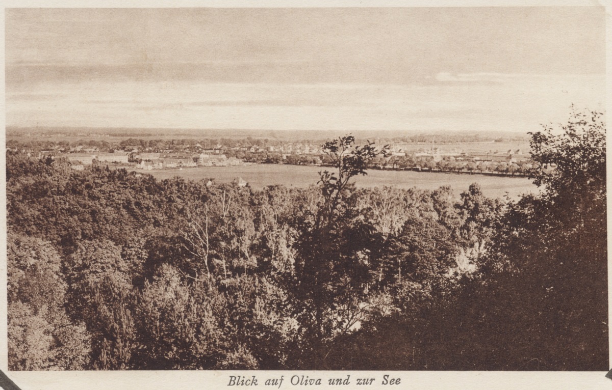 1865. Widok z pawilonu na wzgórzu Karlsberg (Pachołek). Na pierwszym planie kościół i klasztor pocysterski. W głębi domki przy szlaku łączącym Gdańsk z Sopotem (al. Grunwaldzka). Dalej fragment boru sosnowego wyciętego ostatecznie w 1870 roku.