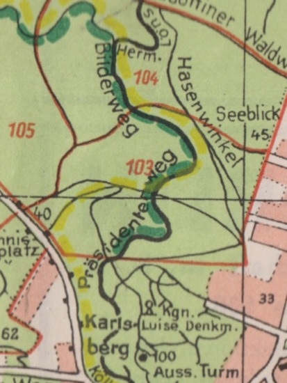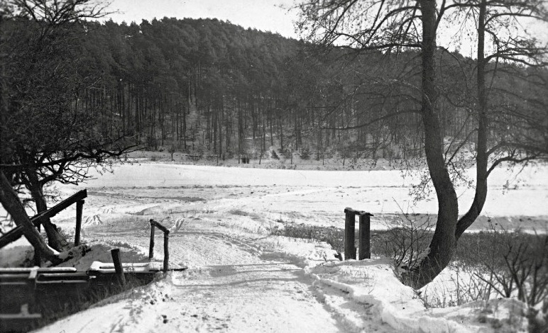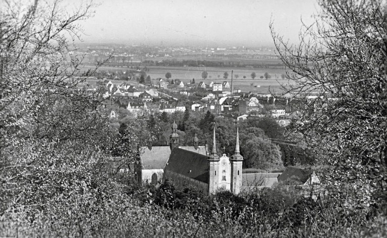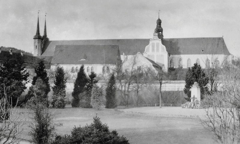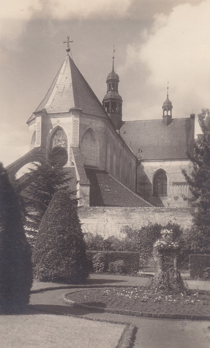 Na fotografii usunięty w kwietniu 1945 roku pomnik upamiętniający żołnierzy niemieckich odsłonięty 1. VI. 1924 roku oraz ścieżka łącząca ul. Am Schloßgarten (Rybińskiego) z zamurowaną obecnie bramką znajdującą się przy spichlerzu klasztornym.