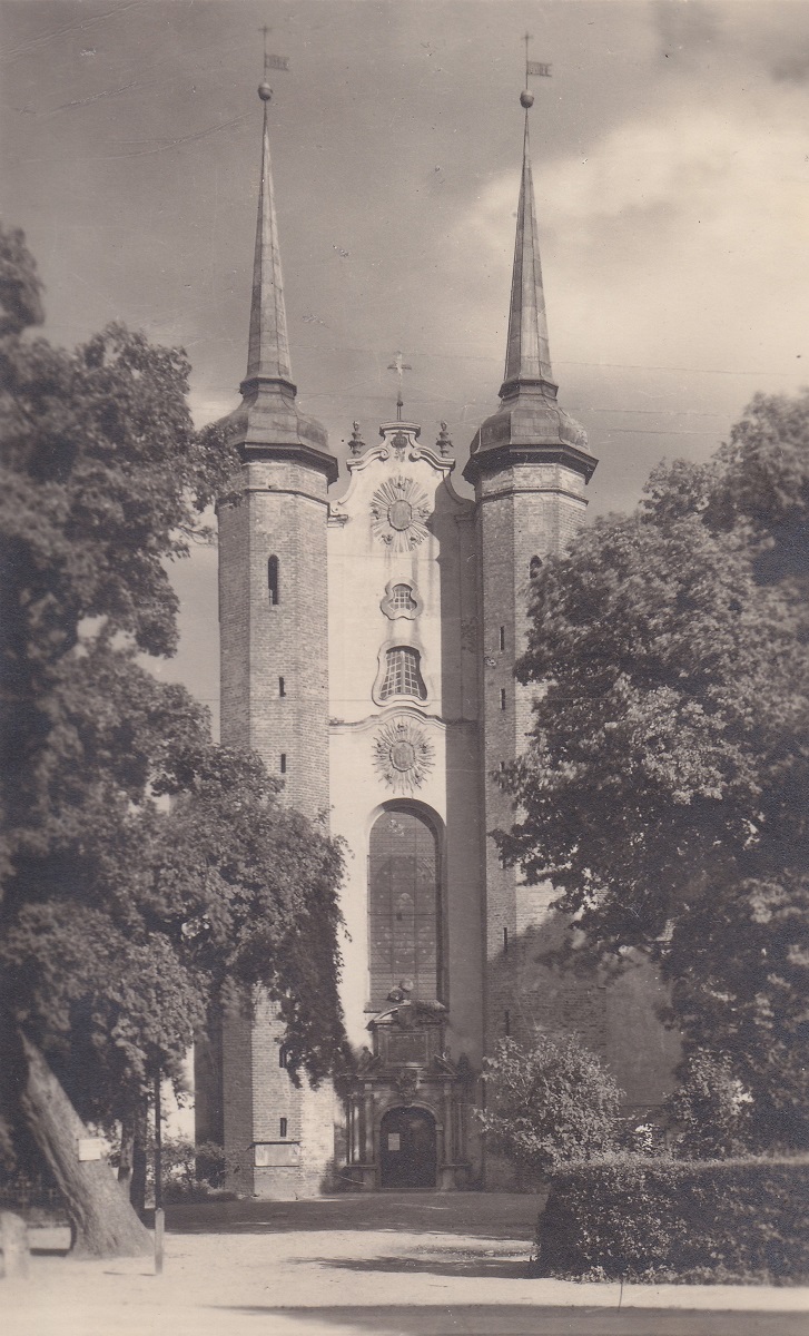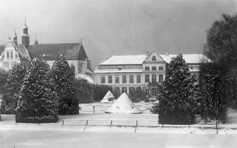 Fasada zachodnia Katedry Oliwskiej i plac pomiędzy ul. Klosterstraße (obecnie ul. Cystersów) a portalem głównym katedry ufundowanym przez opata Michała Antoniego Hackiego (1683 - 1703).