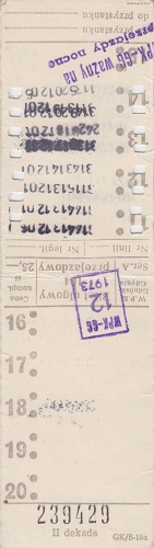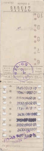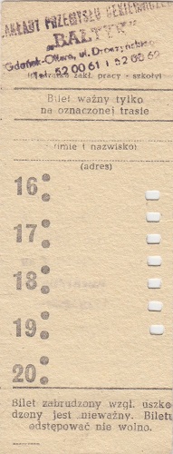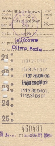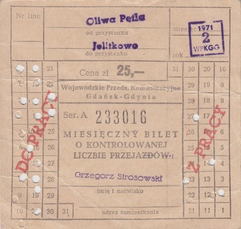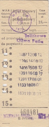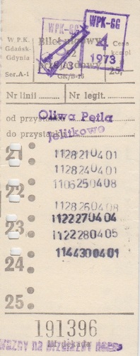 Bilety miesięczne na przejazd trasą Oliwa - Jelitkowo od 1950 do 1975 roku. Od grudnia 1973 trasa już nie jest podawana.