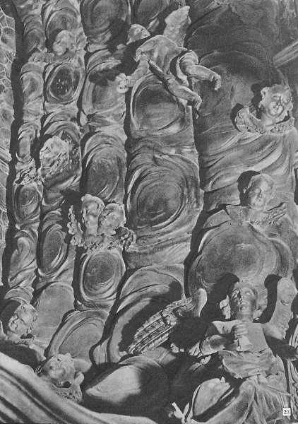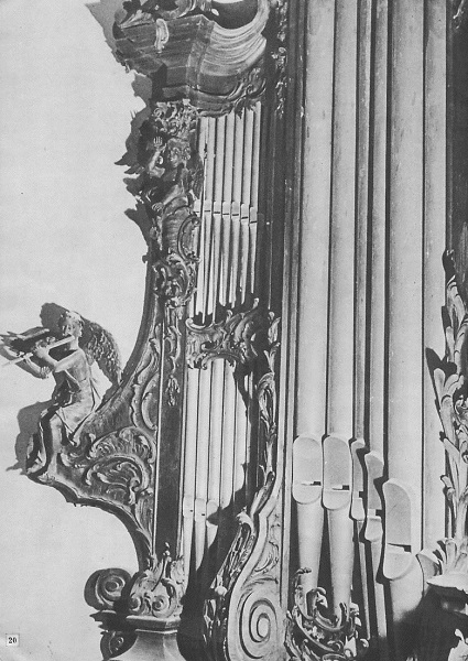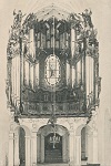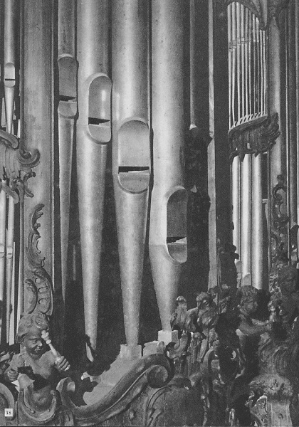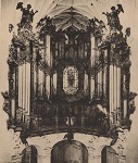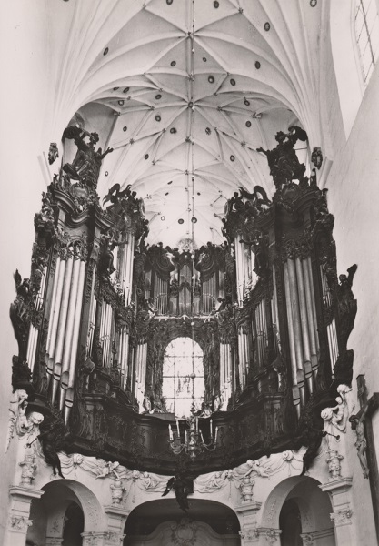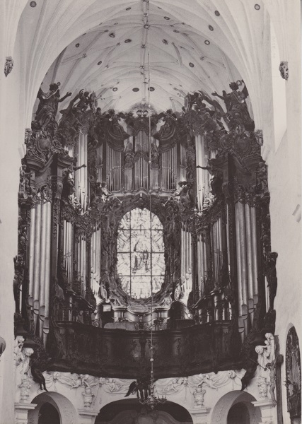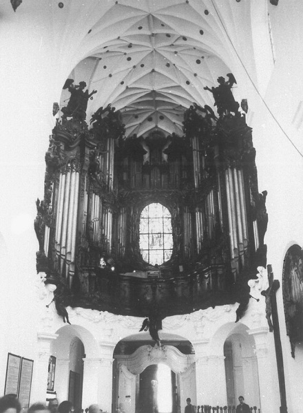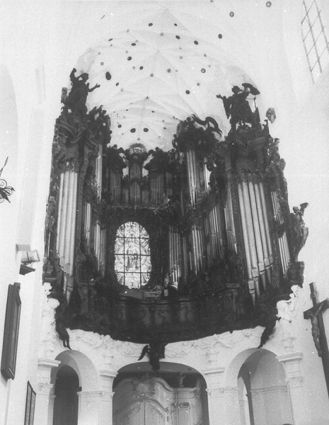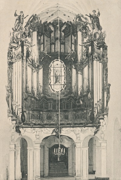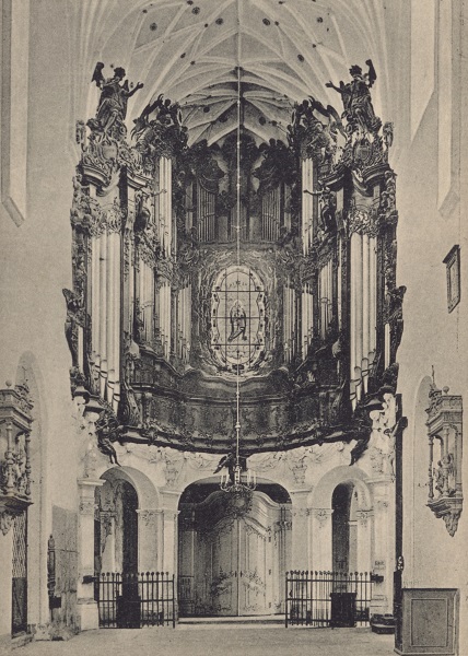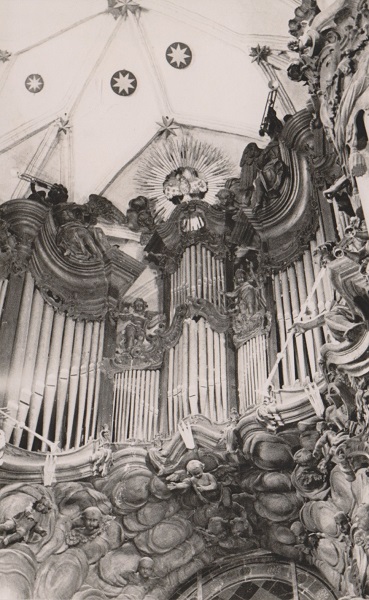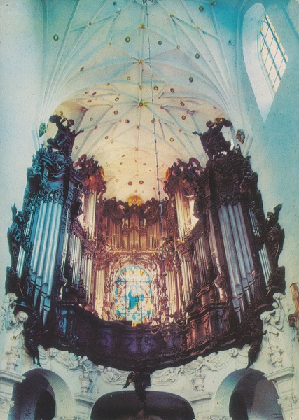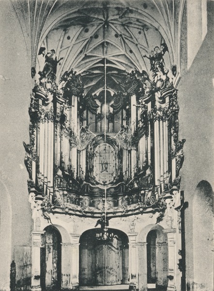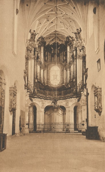 Przestąpiwszy próg świątyni znajduje się zwiedzający pod głównym chórem, na którym zbudowane są wielkie organy. Chór, drewniana ścianka między drzwiami a kościołem, masyw organów wszystko jest utrzymane w stylu rokoko. Wielkie organy uchodzą za największe i najpiękniejsze w Europie. Tylko organy w Leżajsku pod pewnym względem współzawodniczą z tymi. Za opata J. Rybińskiego zostały zbudowane i są dziełem natchnionego mnicha Michała Wulfa.